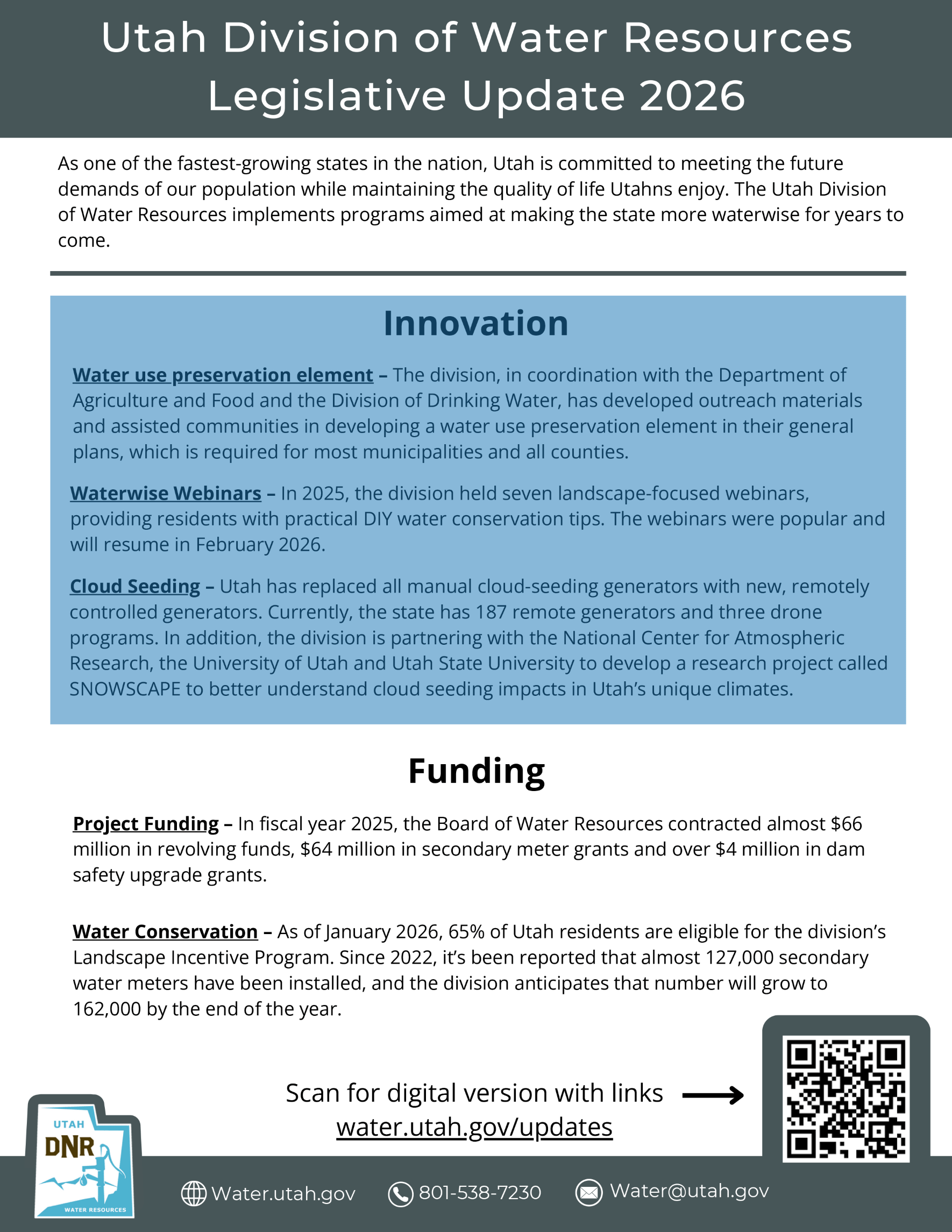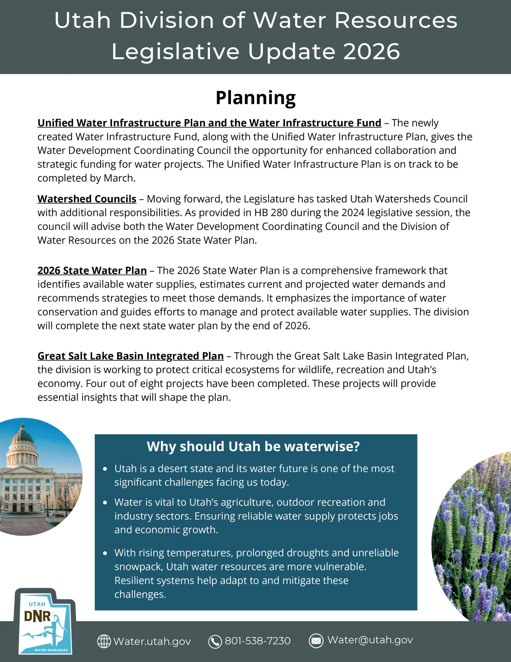 Updates 2026 Legislative Update Please click on the links below for more information on each topic: Innovation Water Use Preservation Element Waterwise Webinars Cloud Seeding Funding Project Funding Water Conservation Planning Unified Water Infrastructure Plan and Water Infrastructure Fund Watershed Councils 2026 State Water Plan Great Salt Lake Integrated Plan